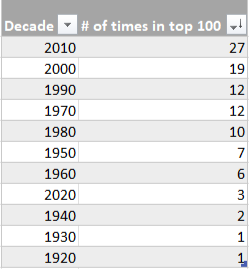 Here is a chart showing the decade representation in the top 100: